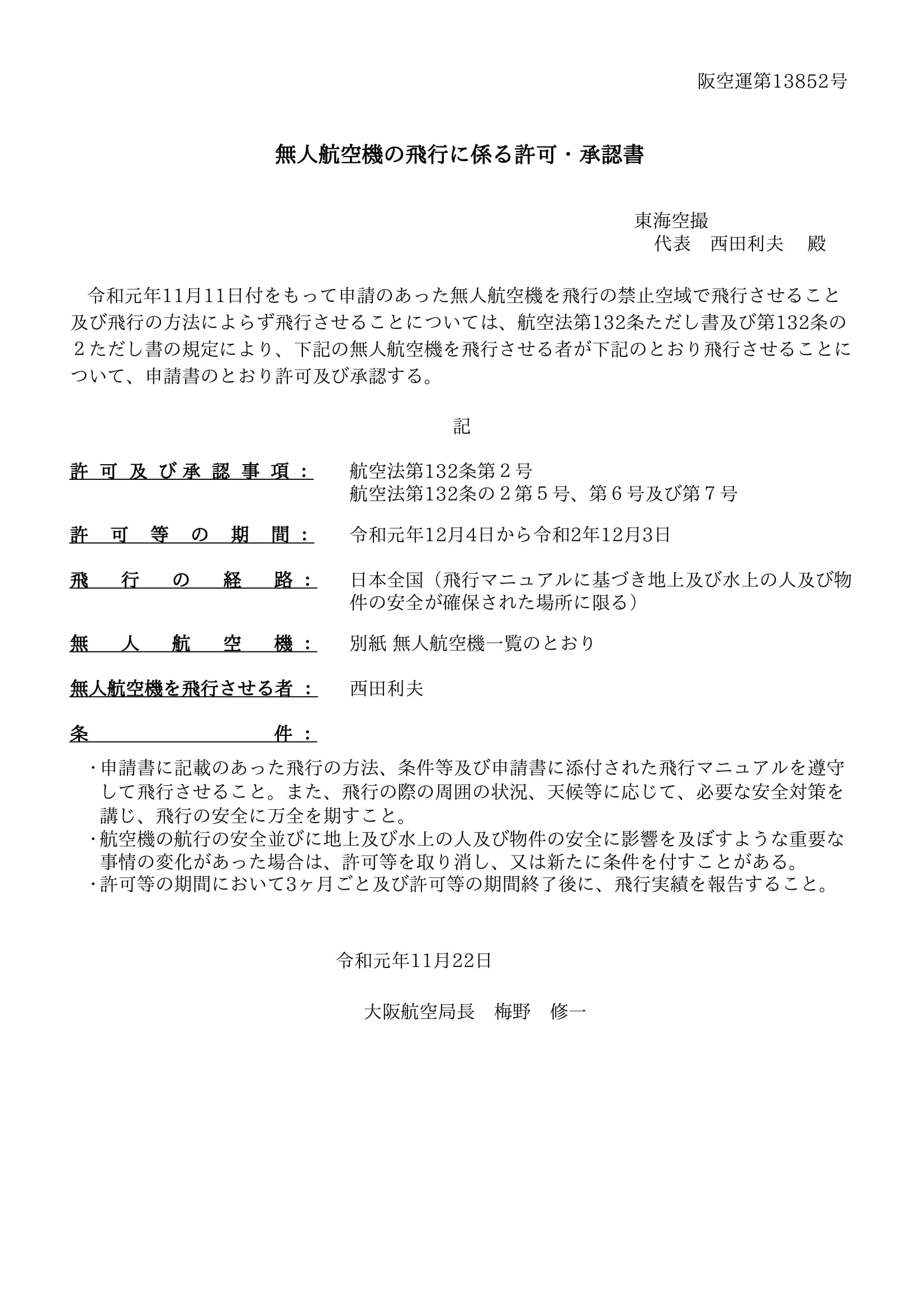 東海空撮ではいち早く国土交通省と調整をつづけ、実績も認められ広告用の空撮企業として2015年12月18日付けで、許認可をいただくことができました。